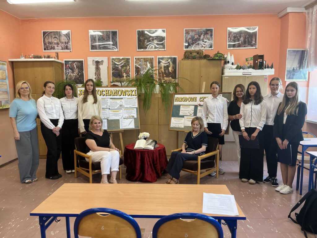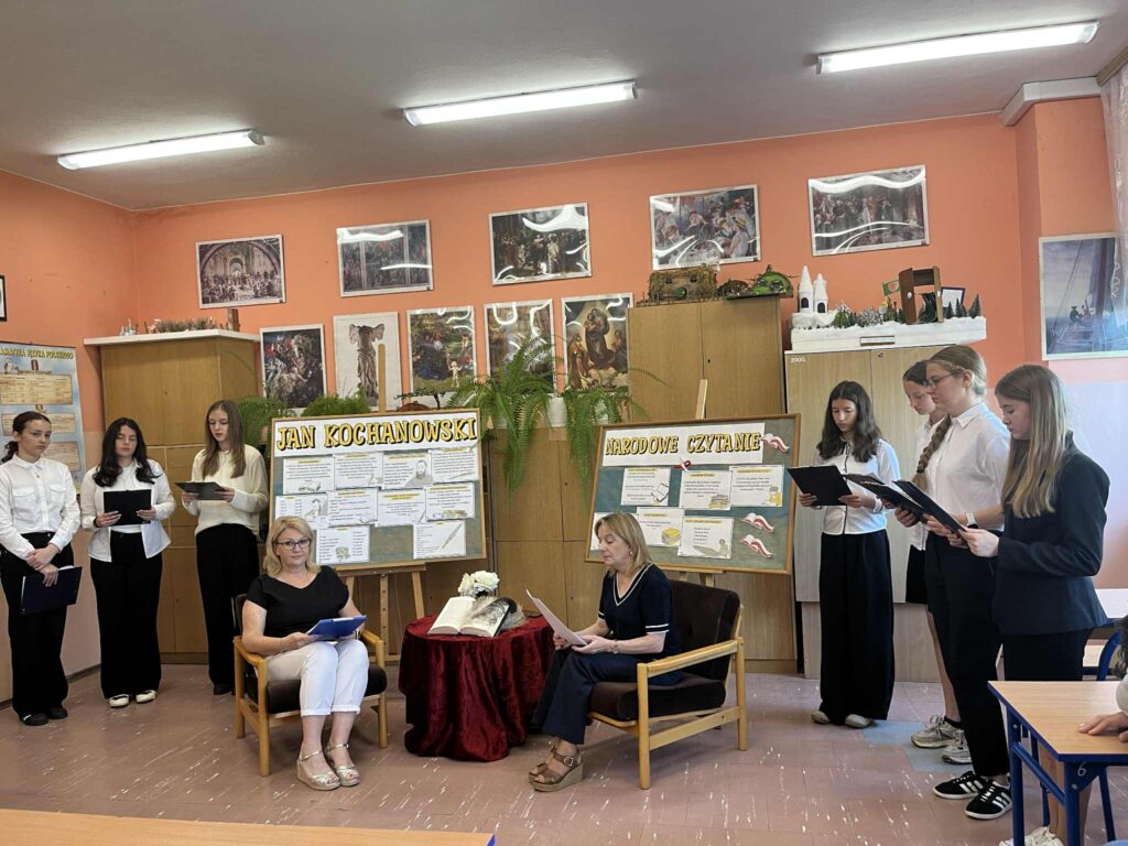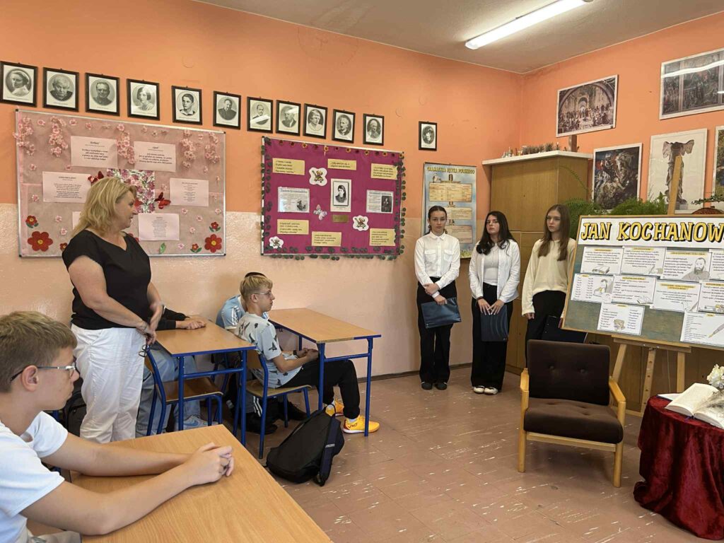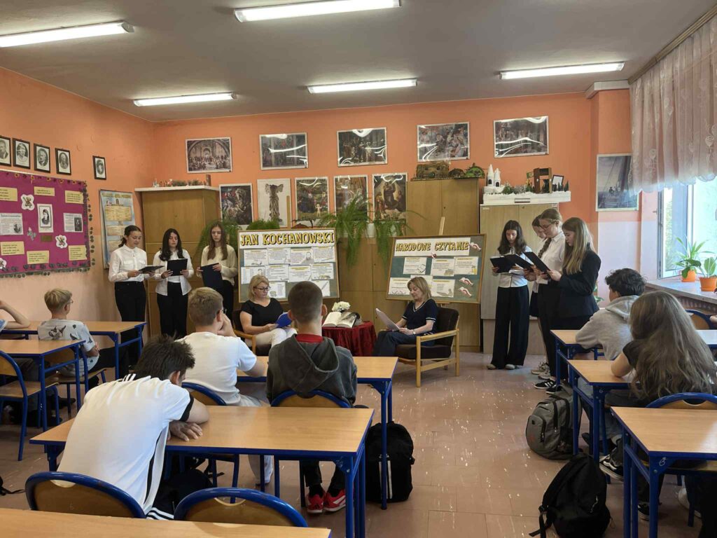 Cała Polska czyta poezję Jana Kochanowskiego. Jeśli cała Polska…to i nasza szkoła. Nie mogliśmy pozostać obojętni, zwłaszcza, że twórczość Mistrza z Czarnolasu jest niezwykle piękna, pouczająca i zdecydowanie ponadczasowa. W poetycką podróż do epoki Jan Kochanowskiego zabrały uczniów klas ósmych dziewczęta z Koła Teatralnego , które przybliżyły nie tylko kontekst powstania fraszek, ale również ich treść. Było to wyjątkowe przeżycie, gdyż do akcji czytania włączyły się Panie Dyrektor Lidia Malinowska i Wicedyrektor Aurelia Kurach, które pięknie przeczytały fraszki Mistrza Jana. Całości dopełnił komentarz Pani Małgorzaty Ochocińskiej przybliżający uczniom ideę i sens akcji .