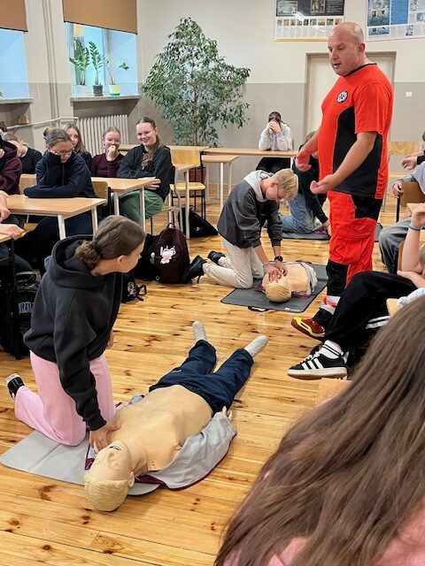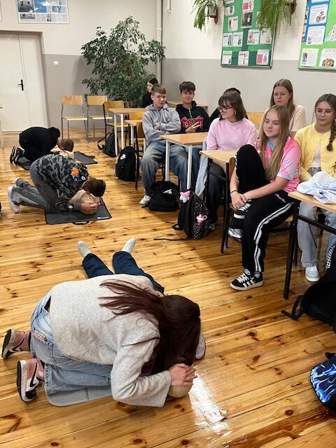 Warsztaty prowadzone były przez wykwalifikowanego ratownika medycznego, który przeprowadził część teoretyczną, a następnie przeszedł do części praktycznej.