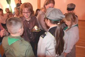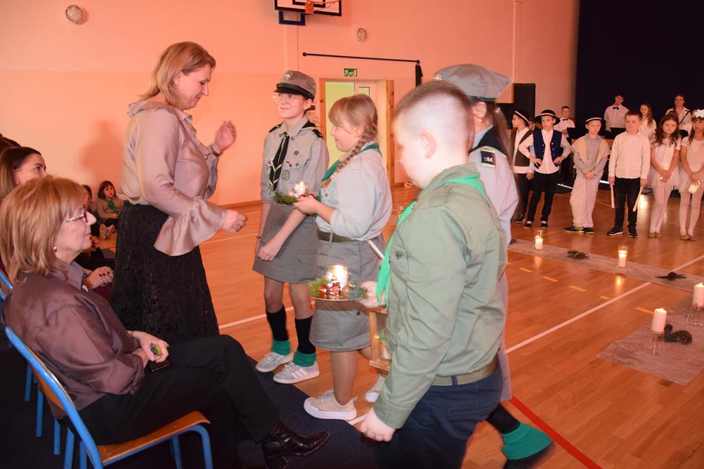 Głos zabrali również p. Marta Kęsicka i ksiądz proboszcz. W swoich przemowach podziękowali za piękną prezentację jasełek i życzyli również wszystkim zdrowych i wesołych świąt. Nie zabrakło też harcerskich życzeń i przekazania na ręce pań Dyrektor Betlejemskiego Światła Pokoju. Harcerze przywieźli światełko z Zakopanego od słowackich kolegów.