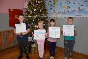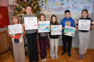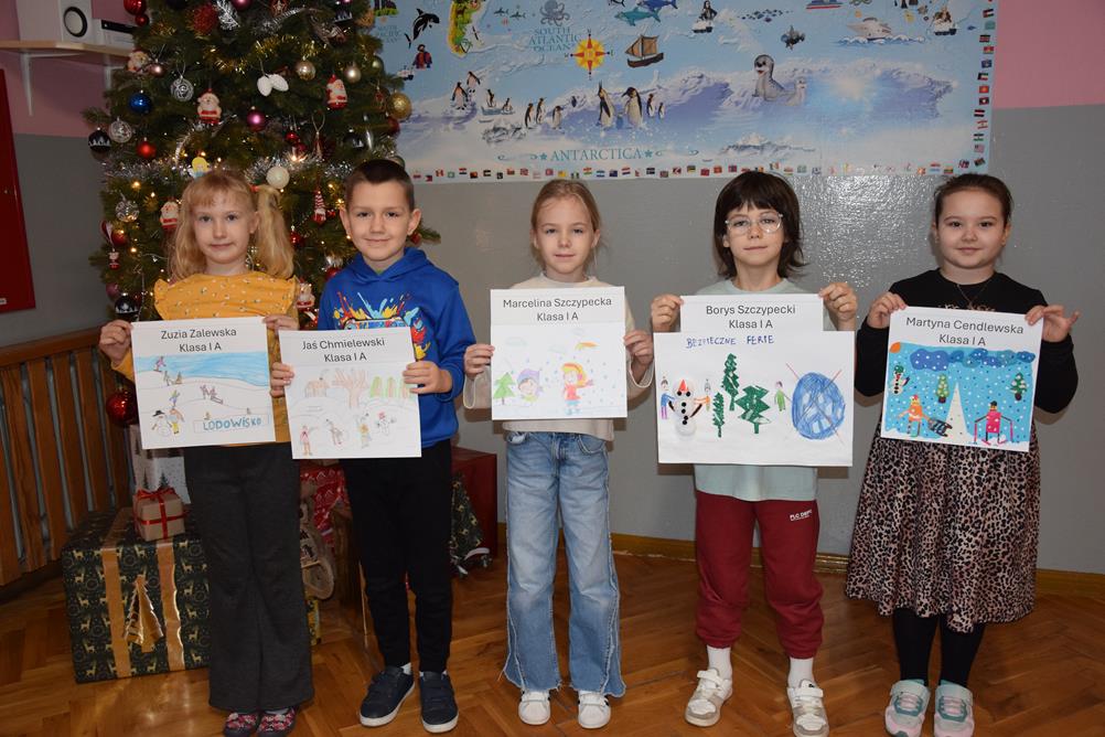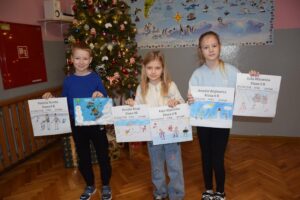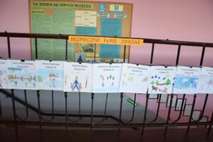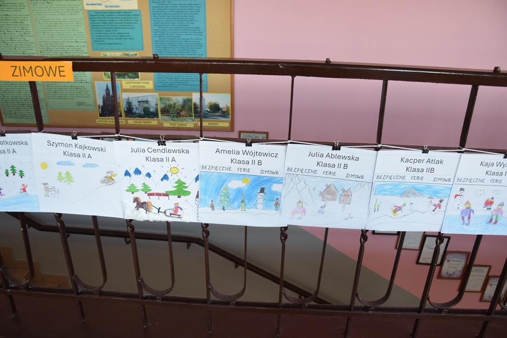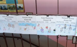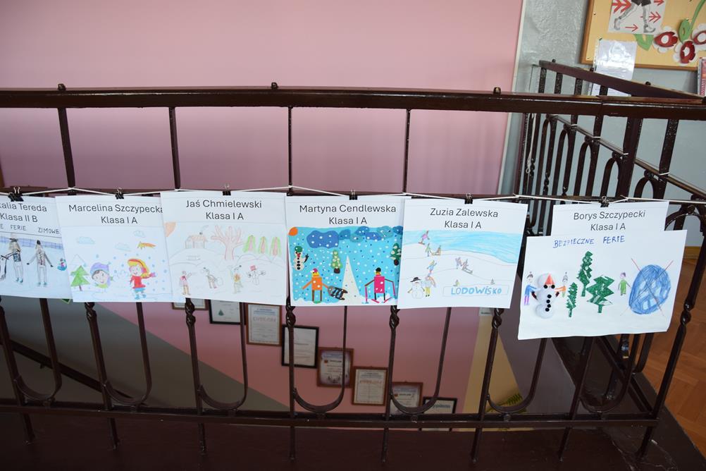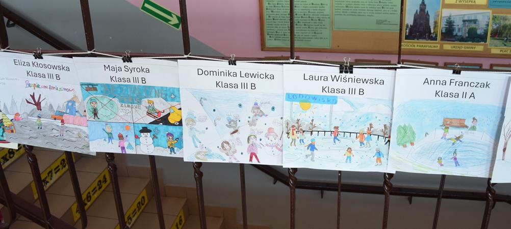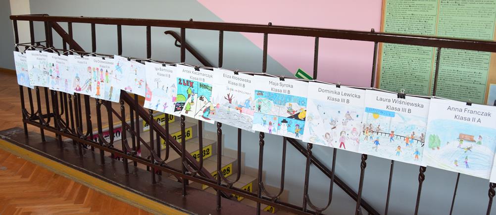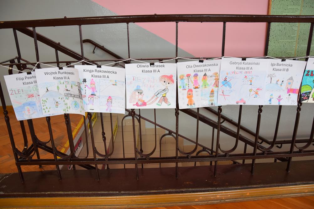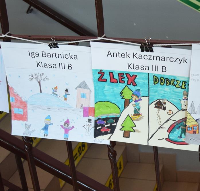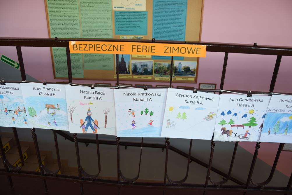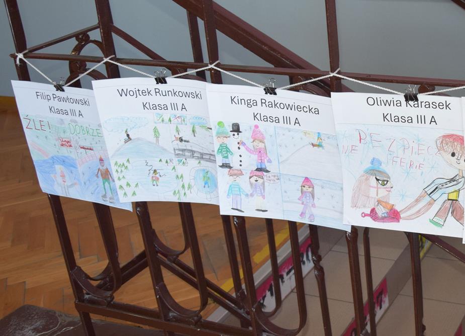Właśnie z myślą o bezpiecznym wypoczynku w klasach I–III zorganizowano konkurs plastyczny pt. „Bezpieczne ferie zimowe”. Uczniowie z wielkim zaangażowaniem i wyobraźnią stworzyli przepiękne prace, pełne mądrych przesłań. Spośród nich wybrano po pięć najciekawszych z każdej klasy, które zostały zaprezentowane na górnym korytarzu szkoły.
