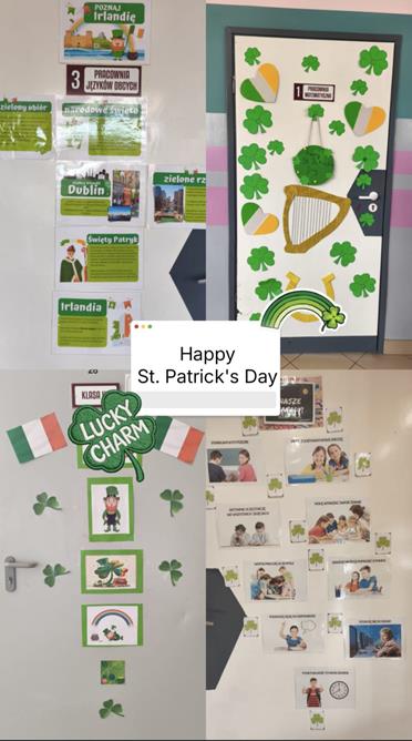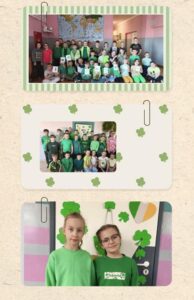 17 marca, Dzień Świętego Patryka, patrona i prekursora chrześcijaństwa w Irlandii obchodziliśmy bardzo wesoło. Dzieci klas młodszych wykonywały lapbooki oraz ozdoby głowy. Drzwi sal lekcyjnych udekorowaliśmy symbolami tego irlandzkiego święta, ucząc się angielskich słówek i tradycji. Nasze ubrania też miały zielone elementy, było wesoło i kolorowo. Z niecierpliwością czekamy na kolejne zielone szaleństwo za rok.