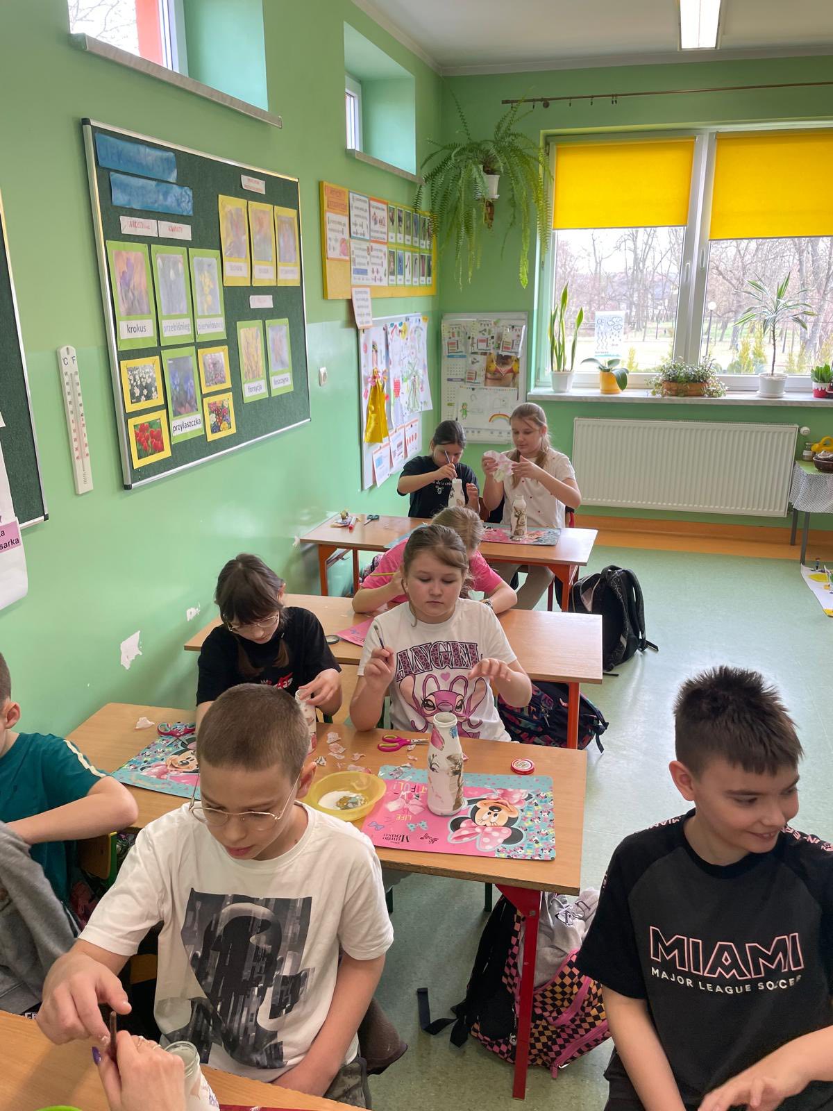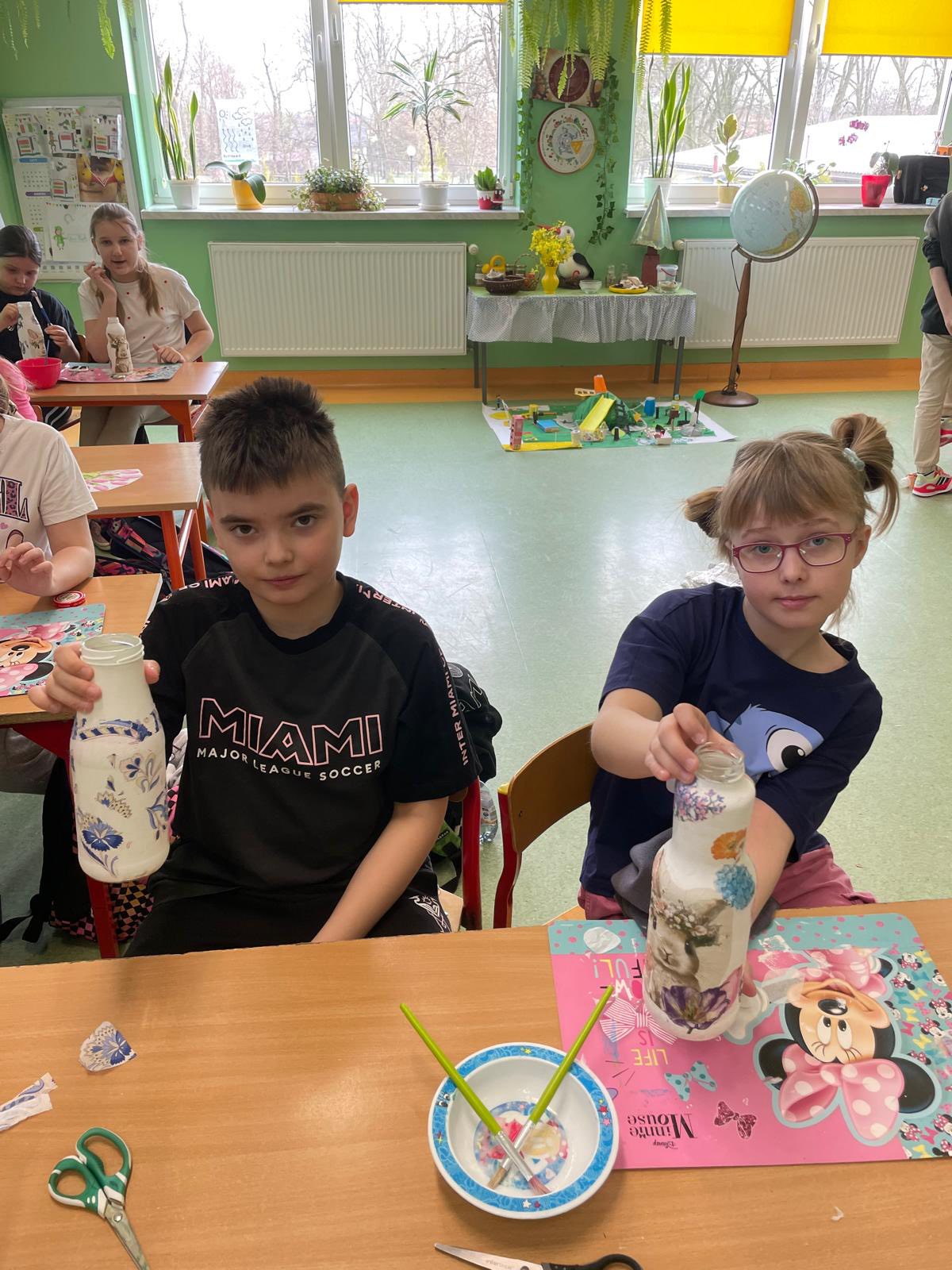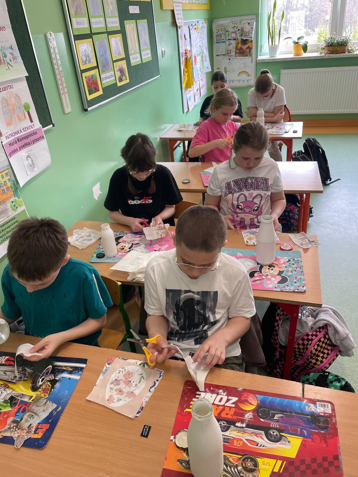 W ramach kreatywnych warsztatów uczniowie klasy 3b wykonali wiosenne wazony techniką decoupage ![]()