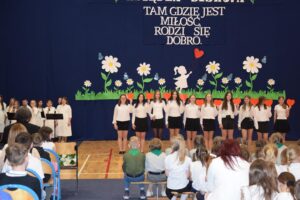 Tak więc trwają wiara ,nadzieja i miłość. Z nich zaś największa jest miłość-pisał św. Paweł w I Liście do Koryntian. Hymn o miłości uświadamia nam czym jest miłość. A jest nią wszystko, co doprowadza nas do Boga. To miłość, z którą można zrobić wszystko, a bez niej nic się nie udaje. I ten sens pięknie przedstawiły nam uczennice klas VII-VIII. Dopełnieniem tych słów stała się pieśń -Ty tylko mnie poprowadź w wykonaniu naszego chóru. Tobie Panie powierzam mą drogę i wszystko ,co mam ,życie a właściwie jego małą garść-jak pięknie zaśpiewał Kuba Nagiewicz w piosence-Życia mała garść.