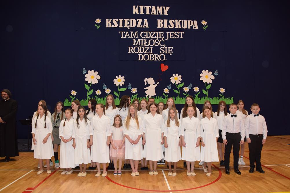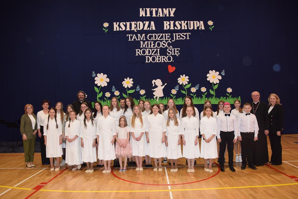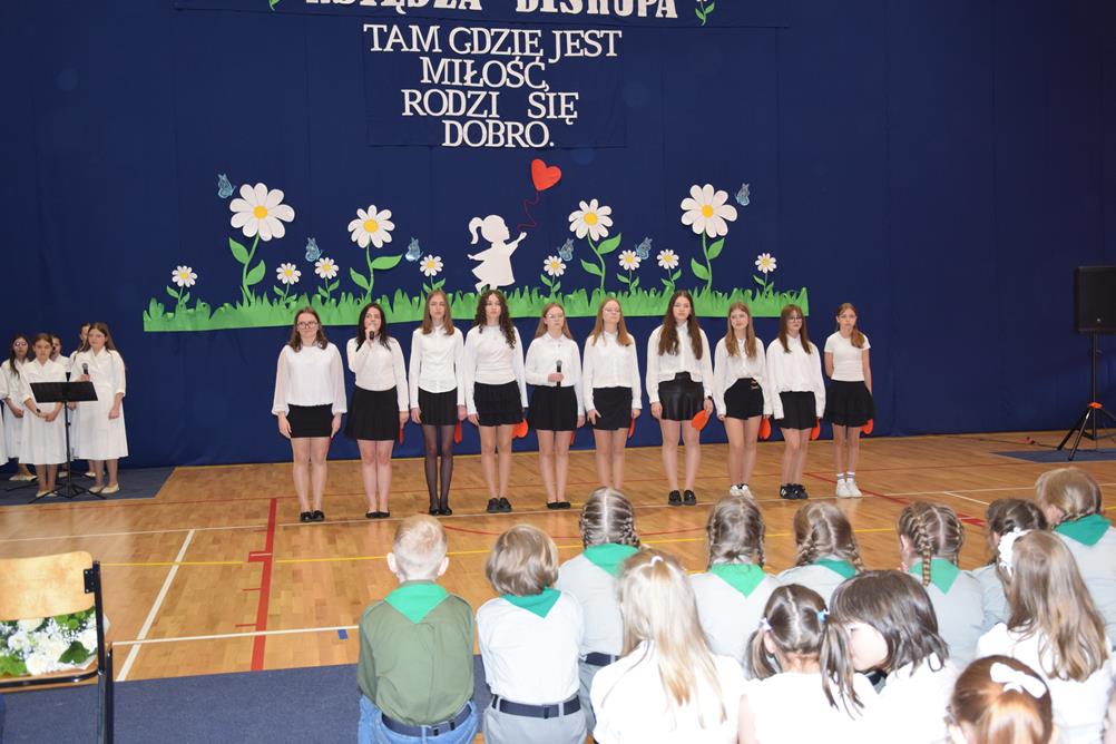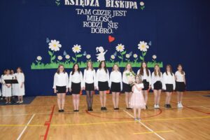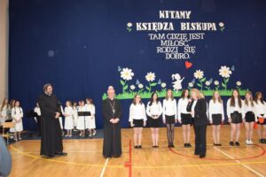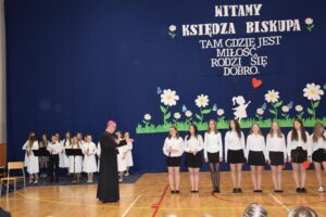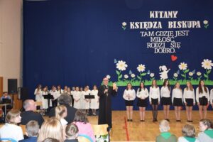 Na zakończenie w swoim krótkim słowie podziękował za wspólne spotkanie ,za życzliwość ,której doświadczył za możliwość spotkania w tej społeczności szkolnej. Ksiądz Biskup nie tylko pochwalił nasz piękny występ, ale dostrzegł nowe stroje chóru, a to buduje i pozwala wierzyć, że warto czynić dobro.