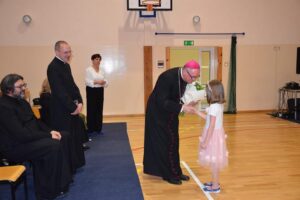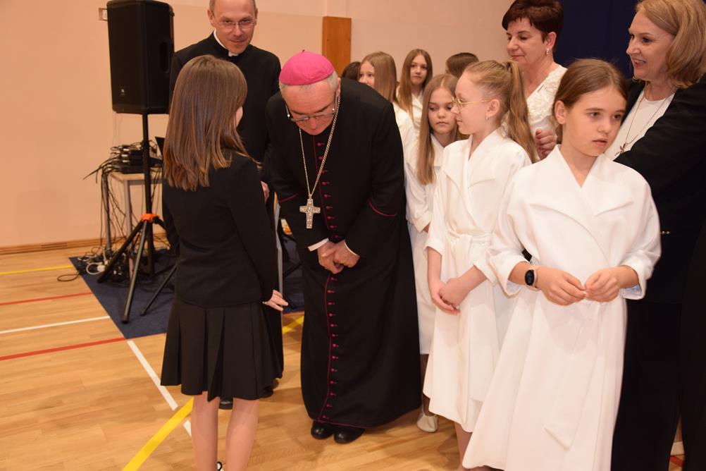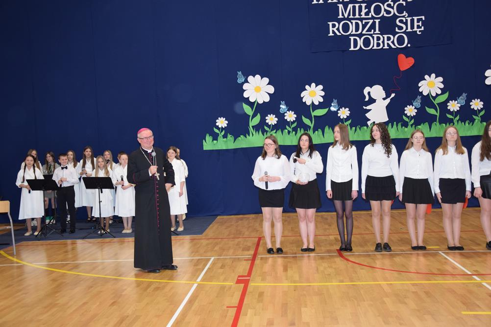Następnie w imieniu wszystkich uczniów Jego Ekscelencję powitała Gabrysia Gierzyńska z klasy Ia, która z wielkim przejęciem wyrecytowała wierszyk i wręczyła bukiet kwiatów .Jej odwaga i dziecięcy uśmiech zachwyciły nie tylko księdza Biskupa. Potem uczniowie zaprezentowali program słowno-muzyczny pt-Miłość cierpliwa przygotowany przez p. Mariolę Wasiołek.