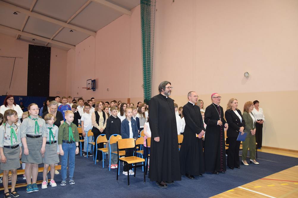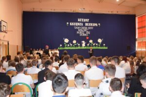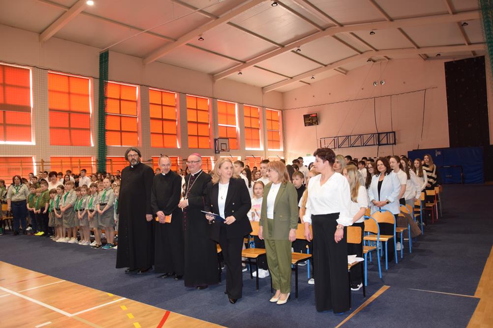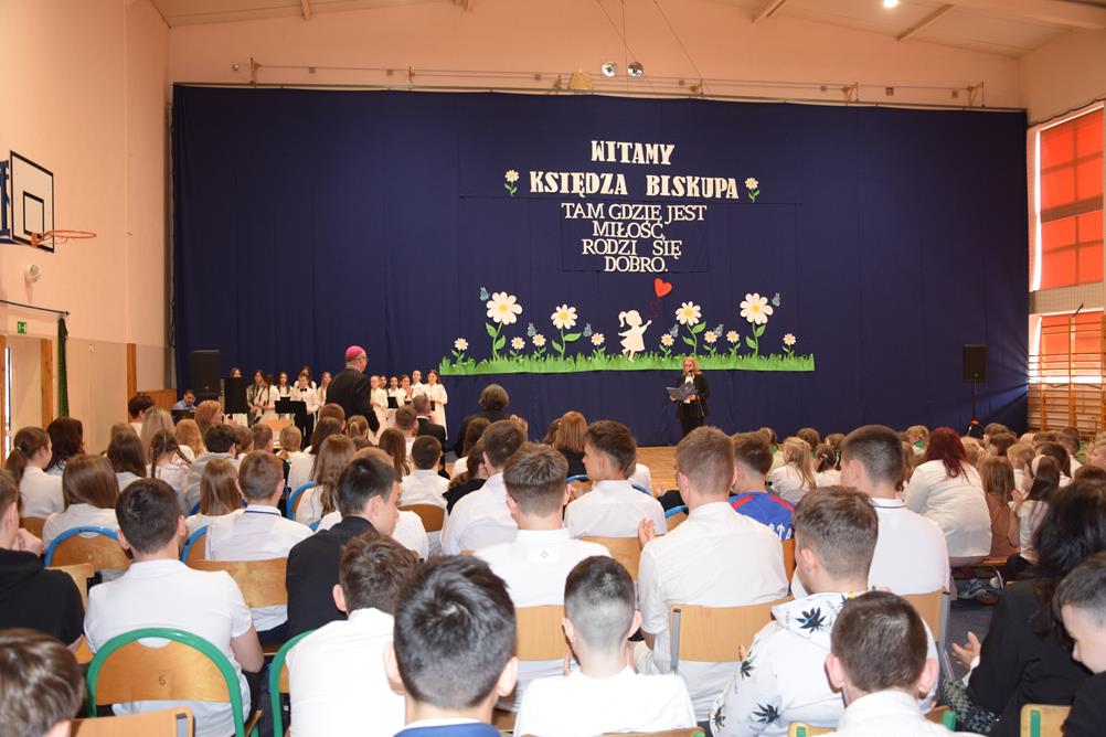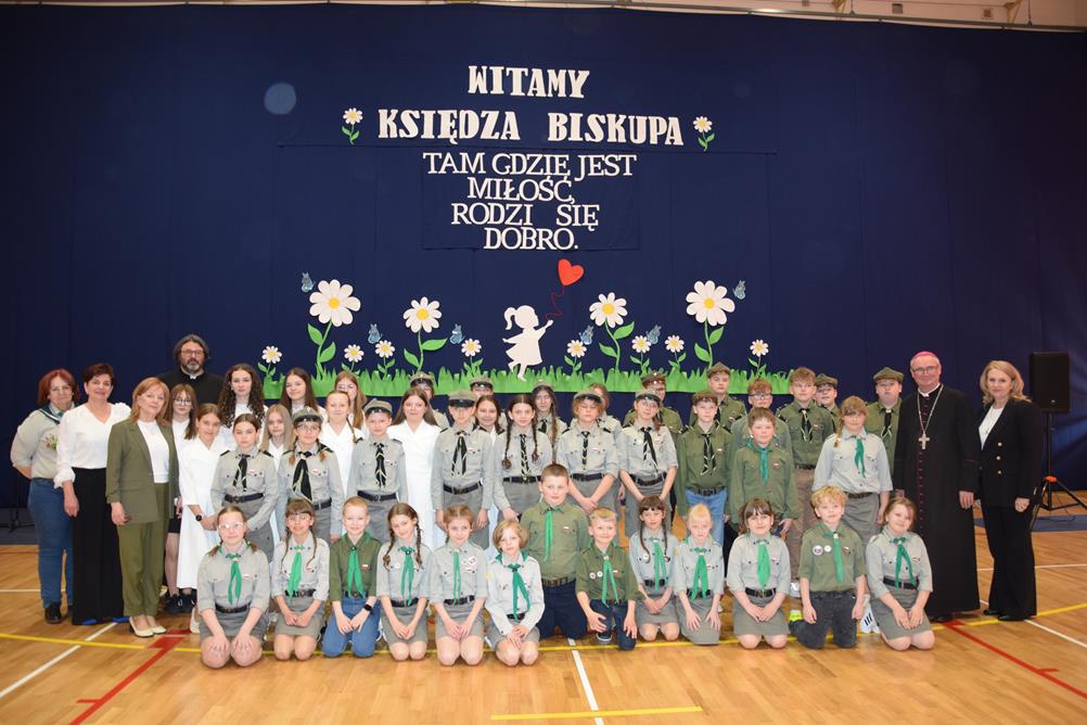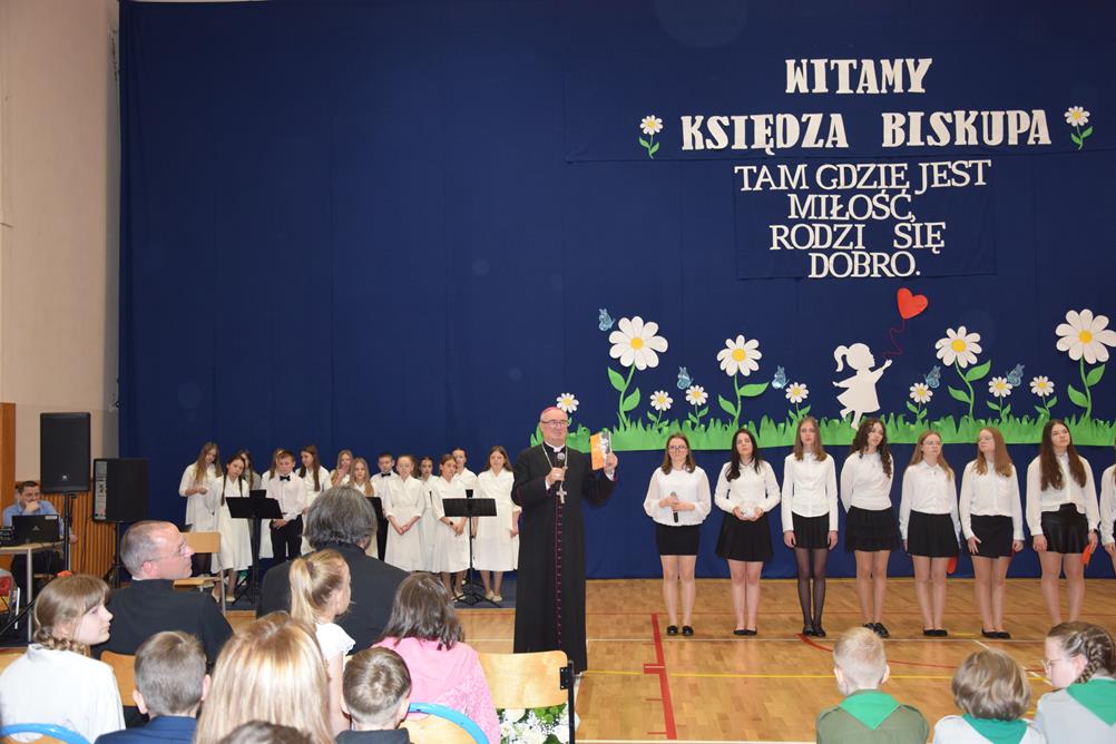 16 kwietnia 2026r. zapisze się na kartach historii naszej szkoły na trwałe. To właśnie dzisiaj przybył z wizytą Biskup płocki Szymon Stułkowski. Szkolna brać powitała dostojnego gościa pieśnią -Bądż pozdrowiony gościu nasz .Następnie głos zabrała p. Dyrektor Lidia Malinowska, która wyraziła ogromną radość z przybycia Jego Ekscelencji, tym bardziej ,że właśnie dziś mija 131 rocznica urodzin biskupa Czesława Kaczmarka ,który pochodził z tej parafii-człowieka ,dla którego honor i prawda były mottem życiowym.