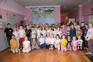 Uczniowie, którzy przyszli do szkoły w ubraniach z elementami kropek, stanęli do pamiątkowych zdjęć. O dużym zainteresowaniu „kropkowym dniem” świadczy wspólne, pamiątkowe zdjęcie.